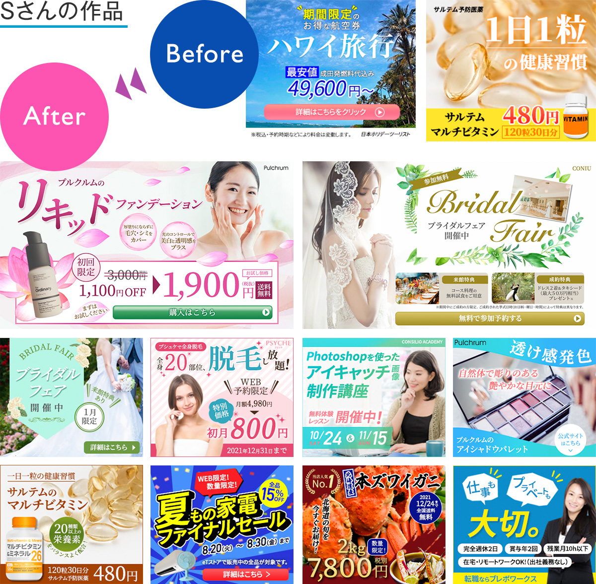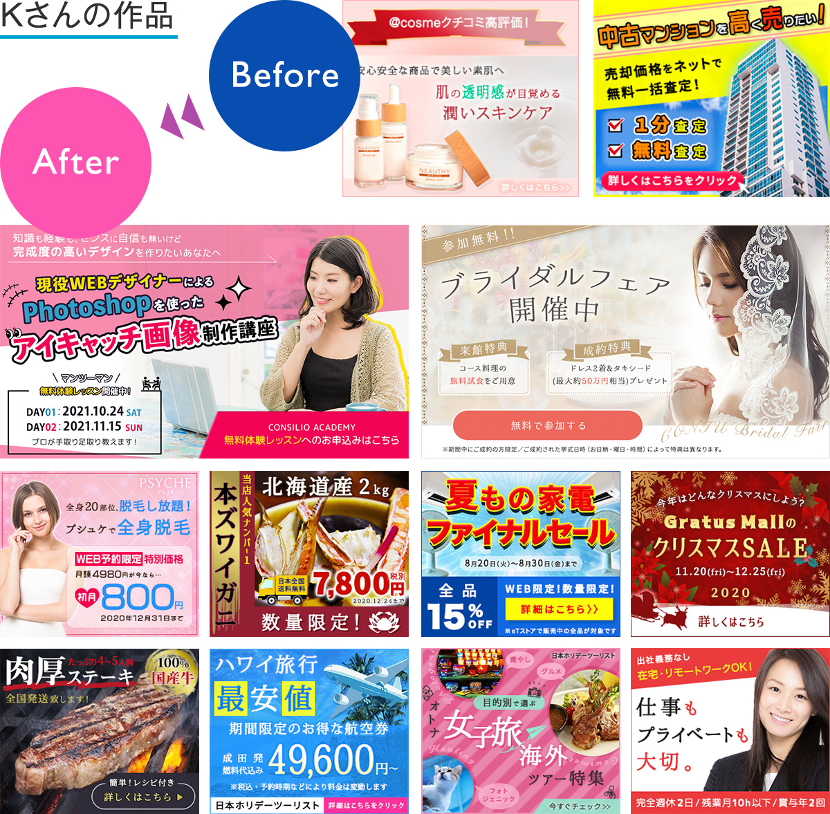 これは現在、Facebookグループで行なっている、お試しのバナー制作課題と原稿は同じです。ですから、毎回ジャンルは変わっていきます。 得意なジャンルもあれば、やったこともないジャンルもあるでしょう。 いろんなジャンルをやることで、応用力もつけていきましょう。