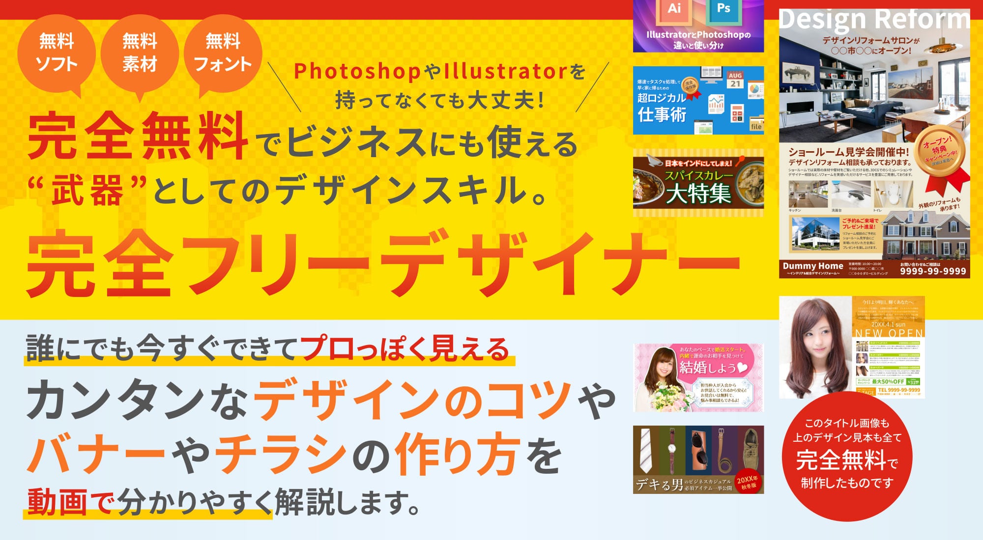 デザインの考え方や制作ツールの使い方、素材調達やリサーチなど、デザイン制作に必要な知識を総合的に学べる講座【完全フリーデザイナー】を教科書として使用します。