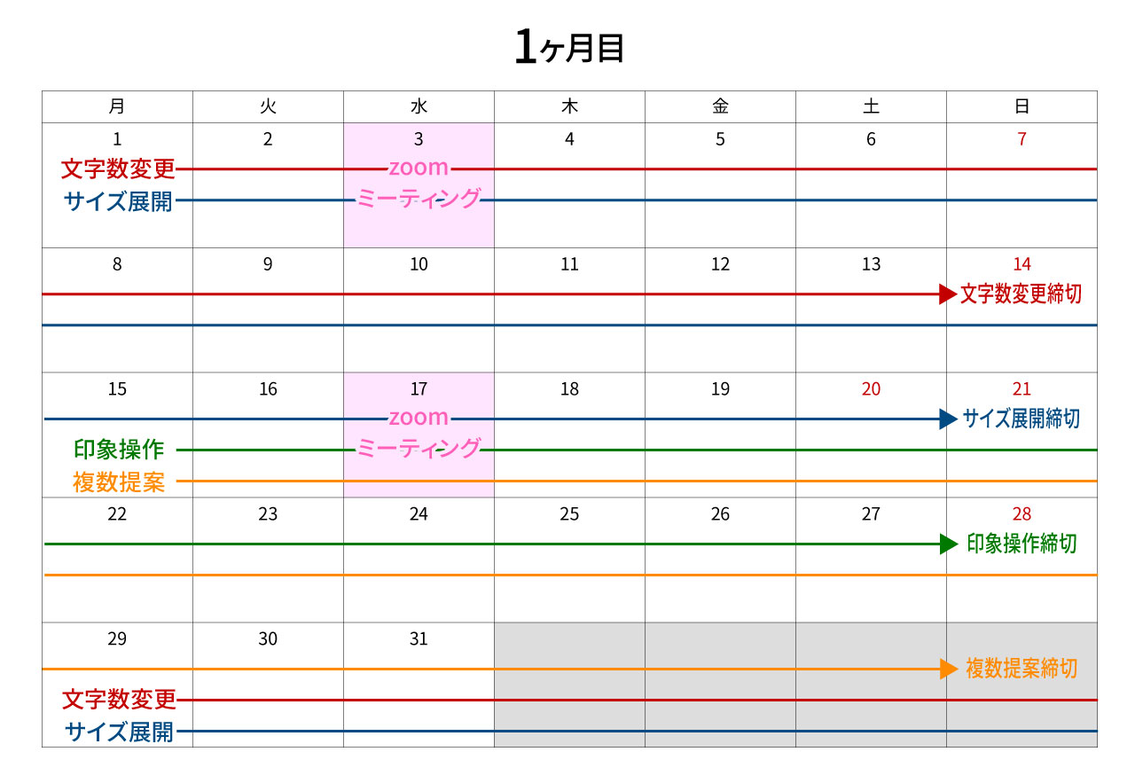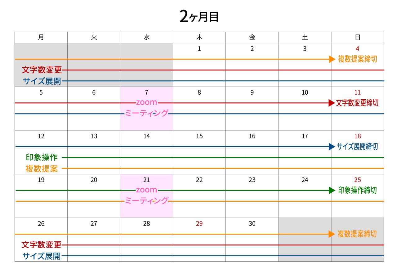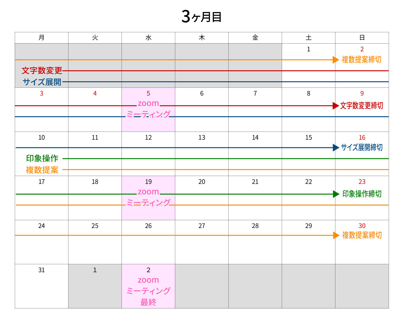 2回目の「サイズ展開」と4回目の「複数提案」の課題提出期限は3週間(作業量が多いので)