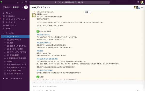 そこで、フリーランスのWEBデザイナーになるための前段階としてSlackを使ったコミュニケーションを行なっています。このSlack上では、毎月のオンライン進捗報告会を告知したり、追加コンテンツを共有したり、ためになる情報の共有やちょっとした質問・疑問に答えることなどを行っています。