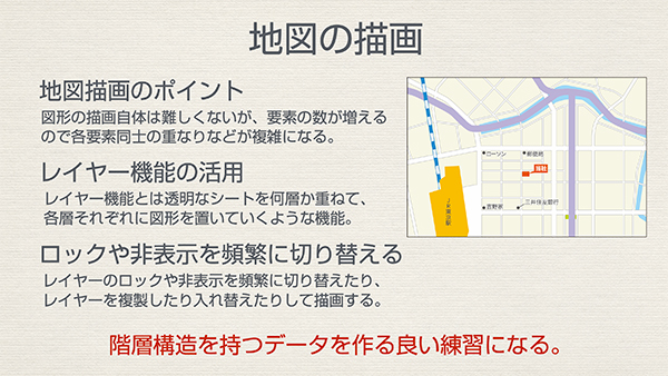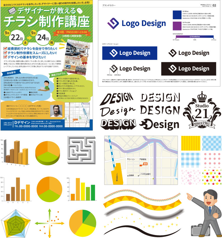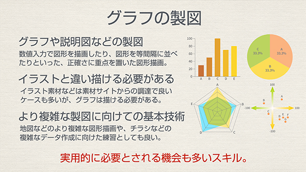 素材制作デザイン理論で解説したロゴマークやロゴマニュアル、グラフ・地図、イラストの描画を通じてillustratorやInkscapeの応用操作を実演を交えながら解説しています。また実演で活用した素材も配布しています。