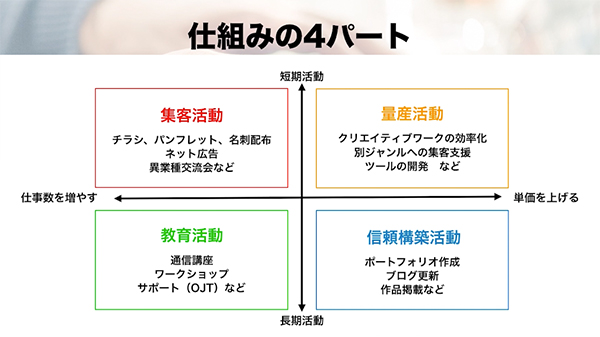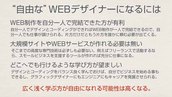 WEBデザインにせよ映像にせよフリーランスを目指した場合、ただ「ものを創るスキルを身につけた」というだけでは、仕事としてなかなか成立しにくいものです。 フリーランスとして安定的に働いていく上で、ルールや基準の作り方、仕組み作りや情報発信についてなど、フリーランスの先輩からのアドバイスとして、ぜひ楽しんでいただければと思います。