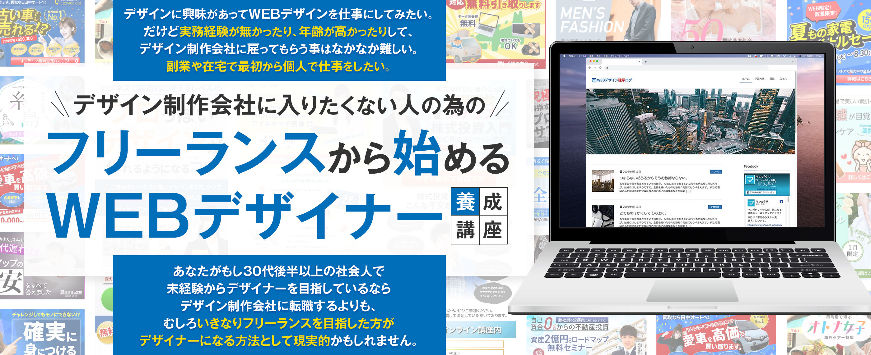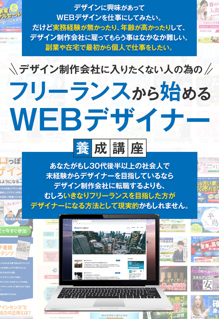WEBデザイナー養成講座では、僕がこれまで制作会社で培ってきたデザインスキルを元に自分なりにわかりやすく体系化したデザイン理論とWEBデザイナーでもなかった僕がいきなりフリーランスになり、試行錯誤で培ってきたビジネスで使える実用的なWEBデザインスキルを、サポート環境含めて手に入れることができます。