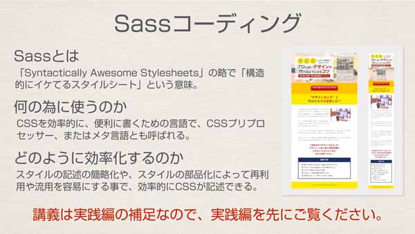 LP制作をより素早く手軽にコーディングしていくためのSassについて実演を交えながら解説しています。