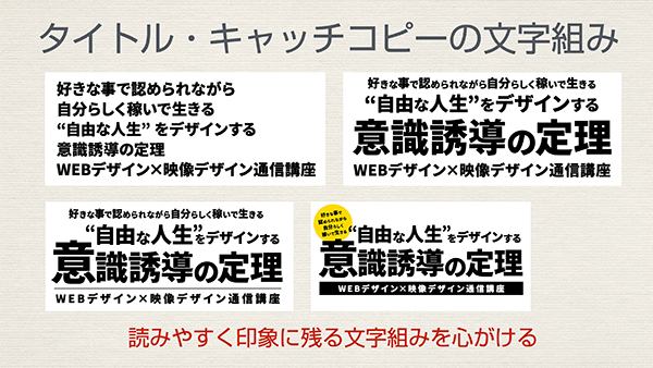 タイトルやキャッチコピーなど、魅力的なコピーをデザイン表現を使って効果的に見せていく文字組みについて、具体的な例を取り上げながら解説しています。