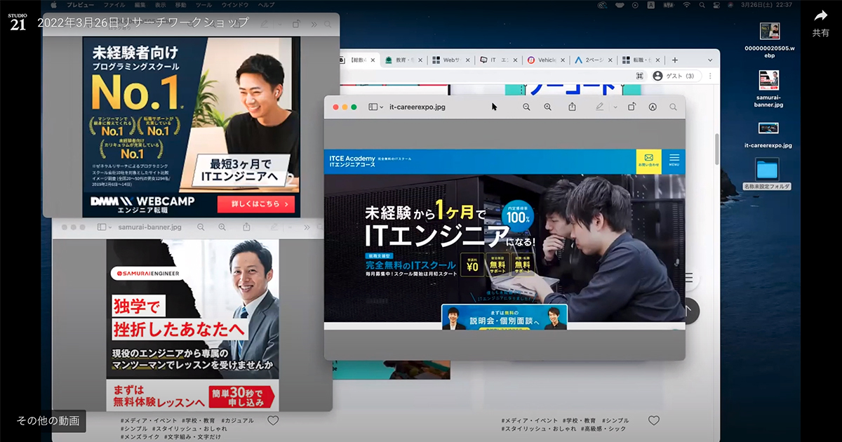 過去に行ってきたデザイン添削会のアーカイブス動画を無期限で閲覧することが可能です。 デザインを直接添削したりアドバイスをいただくことも重要ですが、他の方がどんなところで、どんなアドバイスを受けたのか、添削することになったのかは貴重な情報です。ぜひご自身のスキルアップに活かしてください。